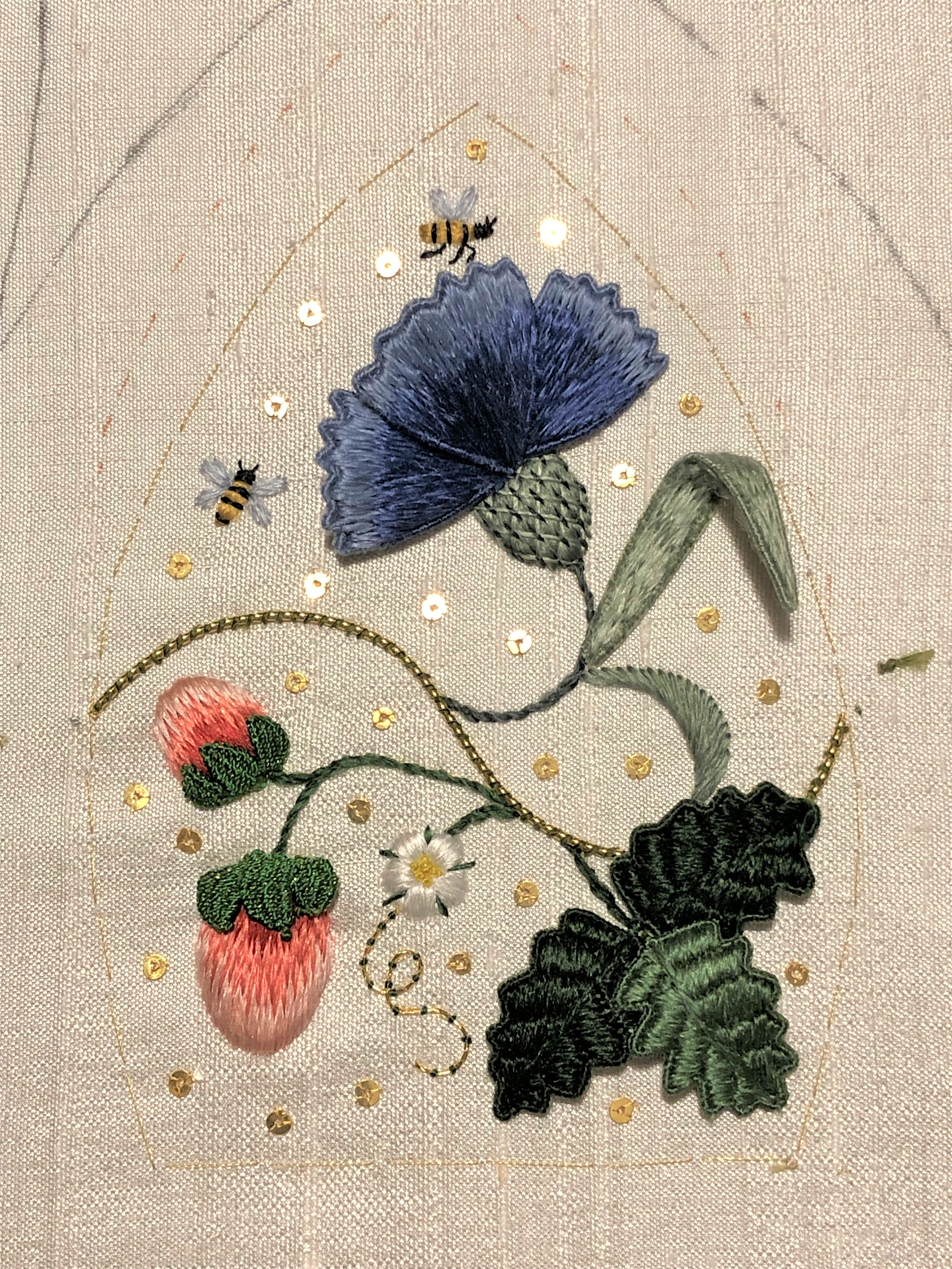 It was quite an adventure figuring out how to do the edge of the daffodil cup and make it look seamless. The center of the pomegranate is filled with tiny garnet beads, so it glows because of the way that the light bounces through them. The butterfly is tiny, but I managed to get several colors of silk and silver thread into the wings.